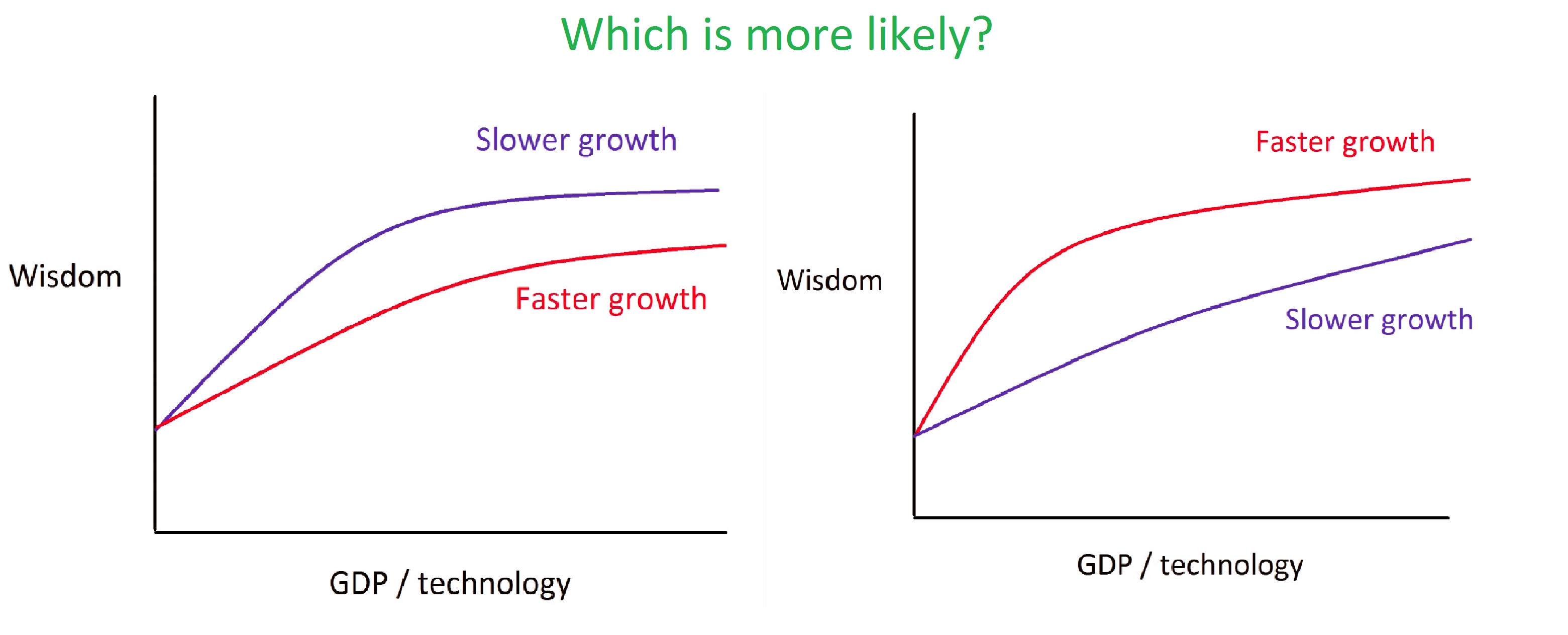 假设人工智能会在地球达到某个特定GDP水平时到来。那么即使我们看到更快的增长与更快的宽容、合作和智慧增长相关,这也不一定意味着我们应该推动更快的增长。问题是,当增长更快或更慢时,GDP的某个百分比增长是否会带来更多的智慧增长。