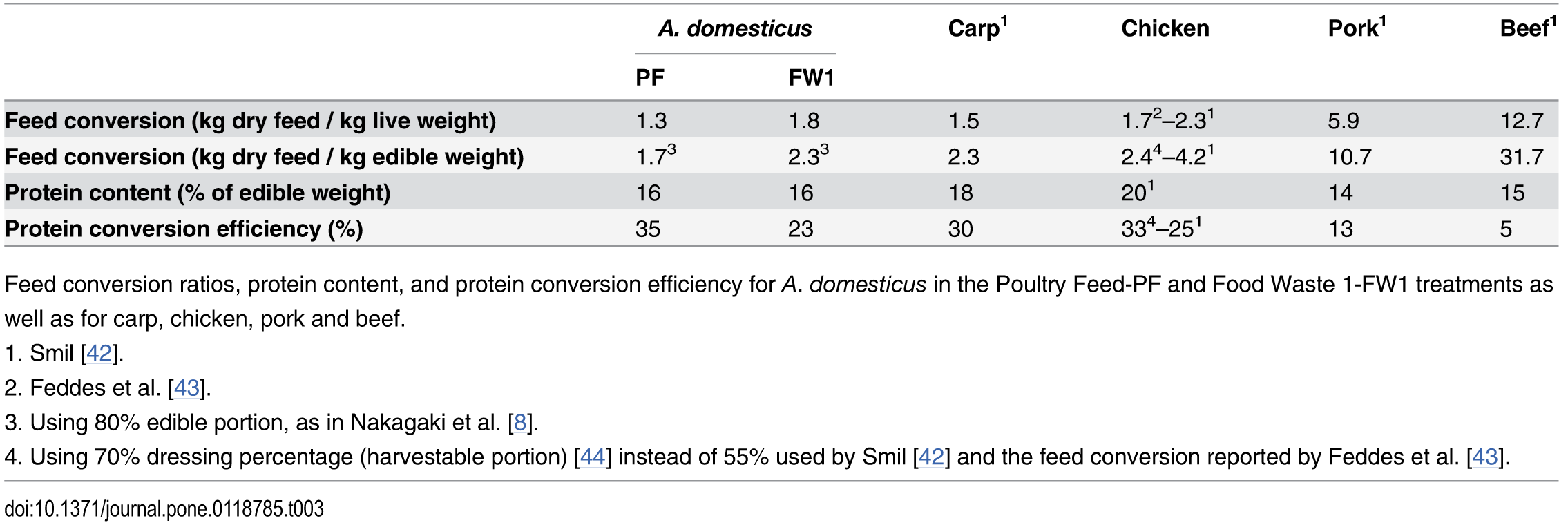 即使在有利于蟋蟀生长的饲料上,饲料转化效率也不一定比鲤鱼或鸡更好(表3):