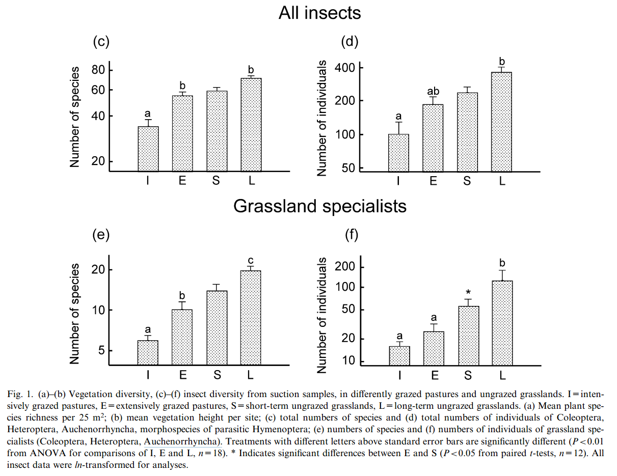 在无脊椎动物中,报告的在中等放牧强度下达到最高多样性或丰度的案例要少得多(Fuentes和Jaksic 1988)。尽管如此,尽管比较不同放牧强度影响的研究很少,但已经有一些分类群报告了这种情况(Smith 1940, Hutchinson和King 1980, Roberts和Morton 1985, Bestelmeyer和Wiens 1996)。通常,随着放牧强度的降低或距上次放牧事件的时间间隔的增加,草地中昆虫物种丰富度和丰度的增加已被观察到(例如,Kruess和Tscharntke 2002a, b)。[...]