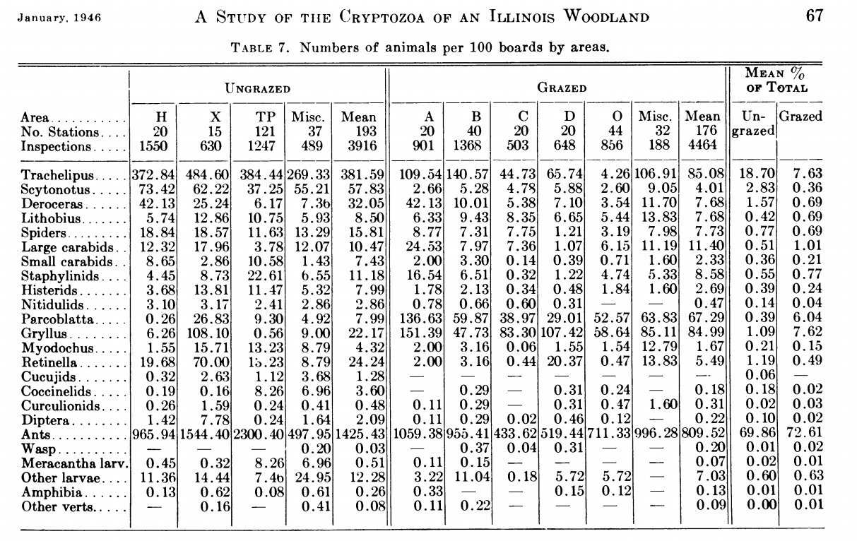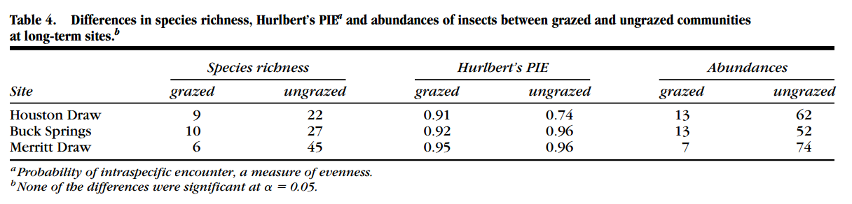 这项研究比较了林地放牧和未放牧部分的无脊椎动物。"这些林地多年来一直被牛放牧,除了一小部分自1935年以来一直被围栏保护不受放牧影响外,大部分地区都没有灌木丛和次生林"(第52页)。研究报告了以下表格: