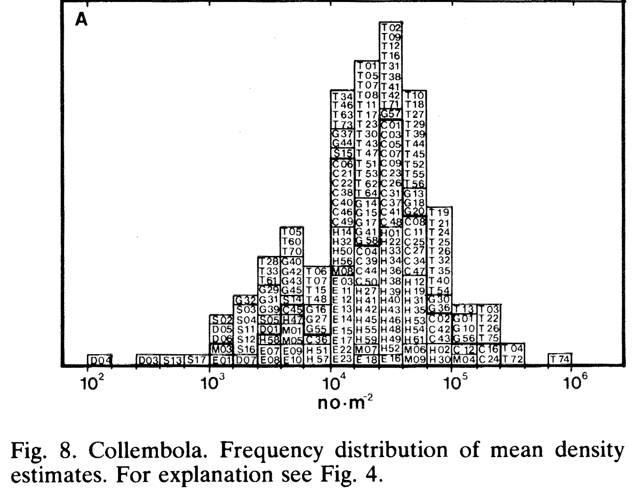 这个图中柱状的高度代表有多少个地点或栖息地测得了每平方米的跳虫数量。你可以看到,大多数测量的密度大约在每平方米104到105个个体的范围内。ID代码以"G"开头的地点是温带草原,以"S"开头的代码是热带草原(第307页)。