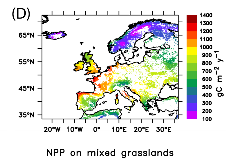 该论文称"使用基于过程的草地生态系统模型PASIM来估计NPP的空间-时间分布,在广泛放牧、集约放牧牧场和饲料生产系统中,提供了750±150 g C的欧洲平均值。"