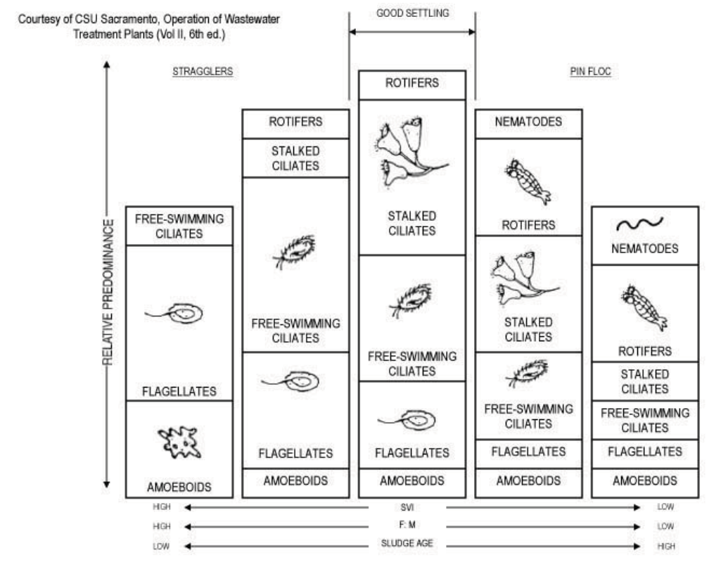 Wisconsin Department of Natural Resources (2010)指出(第1-2页)"随着活性污泥变老,会更常见地看到有柄纤毛虫和轮虫。如果污泥太老,轮虫和线虫将占主导地位。"它用以下图表说明了这一点(第4页):
