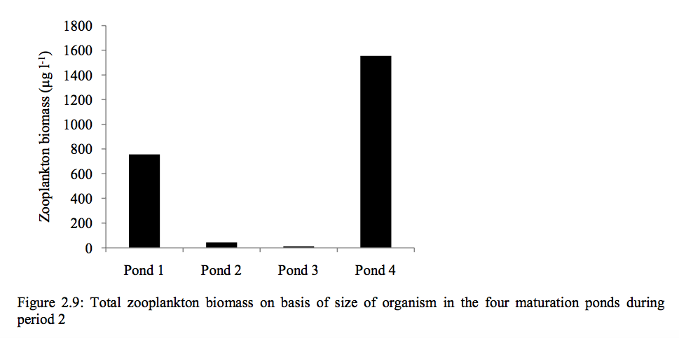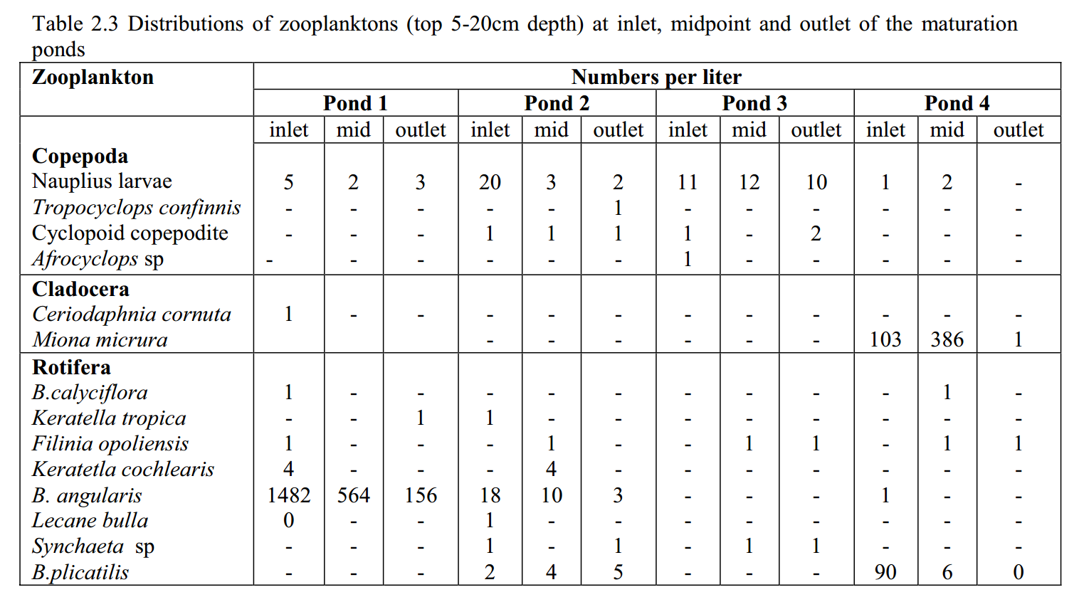 Babu (2011)创建了"在乌干达坎帕拉的热带条件下建造和运行的试点规模废水稳定塘"(第13页)。池塘1是对照组,池塘2到4有实验性的"挡板"("涂有玻璃纤维材料的平板木板")以增加细菌附着的表面积(第22-23页)。下表显示了每升浮游动物的数量(第32页):
