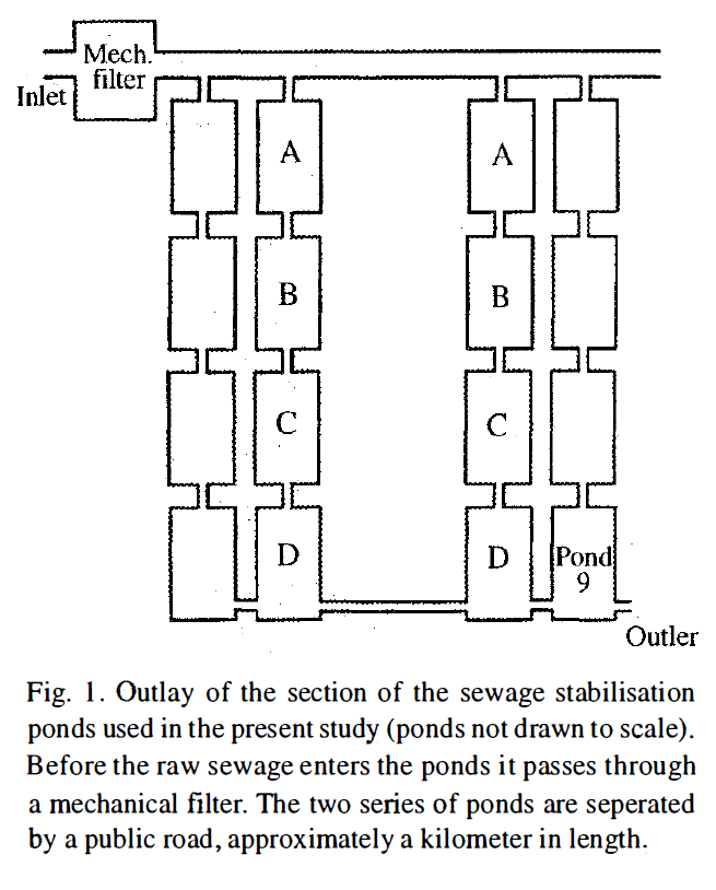 Nandini (1999)研究了印度的稳定塘。这些池塘看起来如下,原始污水从顶部进入,净化后的水从底部流出。