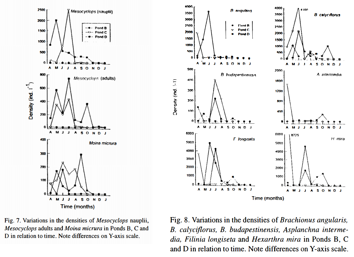 尽管池塘1的总浮游动物数量最多,但池塘4的生物量更高,因为池塘4中丰富的枝角类比池塘1中丰富的轮虫更大(第32页)。