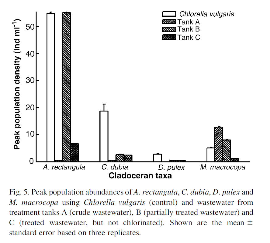 Nandini et al. (2004)研究了"四种枝角类物种,即Alona rectangula、Ceriodaphnia dubia、Moina macrocopa和Daphnia pulex在墨西哥城Iztacalco处理厂废水中的种群生长模式"(第59页)。目标之一是评估这些甲壳类动物"在水产养殖中作为鱼类幼虫的初级饲料"的潜力(第64页),因此作者希望看到大量种群。作者尝试在四个不同的水箱中培养枝角类: