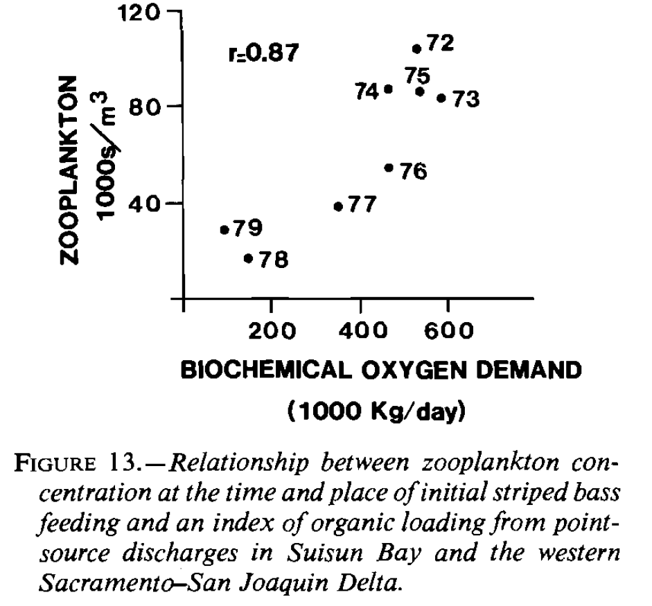 花鲈工作组成员Charles Hanson提出了一个替代假说来解释浮游生物种群的减少。无机营养物浓度没有下降,但Hanson假设在20世纪70年代上半叶,河口点源排放的废物处理改善减少了系统中有机物的贡献,可能导致了Suisun湾和[萨克拉门托-圣华金]三角洲生产力的下降,特别是在被浮游动物食用的微生物的生产方面。在幼年花鲈集中的时间和地点,浮游动物的丰度与Hanson基于Suisun湾和西部三角洲六个点源排放的生化需氧量(BOD)数据的有机负荷指数有很好的相关性[...见我下面复制的图]。[...]