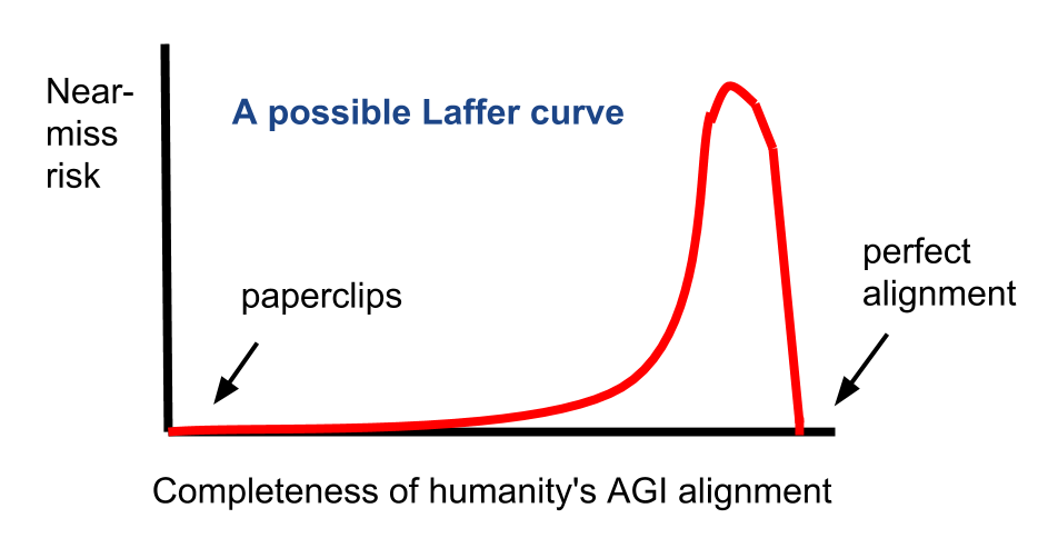 对齐和未对齐的AGI都可能以各种不同的方式产生巨量痛苦。然而,如果我们只关注近乎命中的风险,那么我们会看到类似于拉弗曲线的近乎命中风险,作为人类进行AGI对齐研究程度的函数。如果不进行对齐研究,导致回形针最大化类型的未来,那么近乎命中的风险基本上为零,因为AGI开发根本没有指向人类价值观的方向。同时,如果进行完美的对齐研究,那么AGI将完全与人类价值观对齐,也不会有近乎命中。在这两个极端之间,存在近乎命中的风险,在某个点达到最大值。