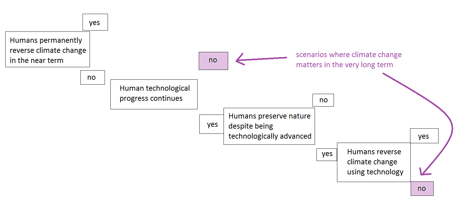 还有另一种相当不太可能的情景,在这种情景中,气候变化的影响可能会持续很长时间:人类开发出通用人工智能,他们对地球生物圈保持足够的情感依恋以保护它,但他们决定不逆转气候变化。我认为先进的地球起源智能会保护地球生物圈的可能性很小,而且即使它这样做了,也不太可能允许气候变化继续不受控制,但为了完整起见,我包括了这种情景。这种可能性是以下流程图中右下角的紫色框。