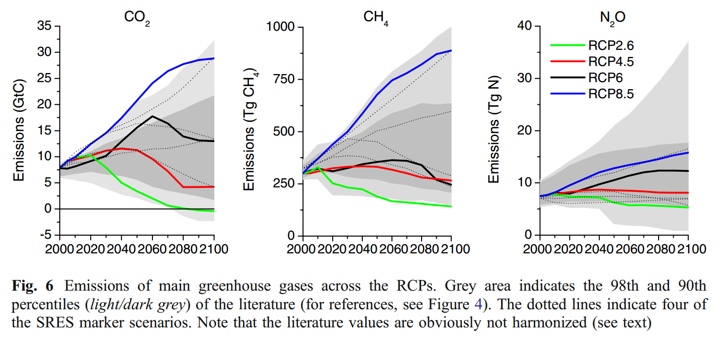 下图显示了代表性浓度路径的四种预测,来自这篇论文: