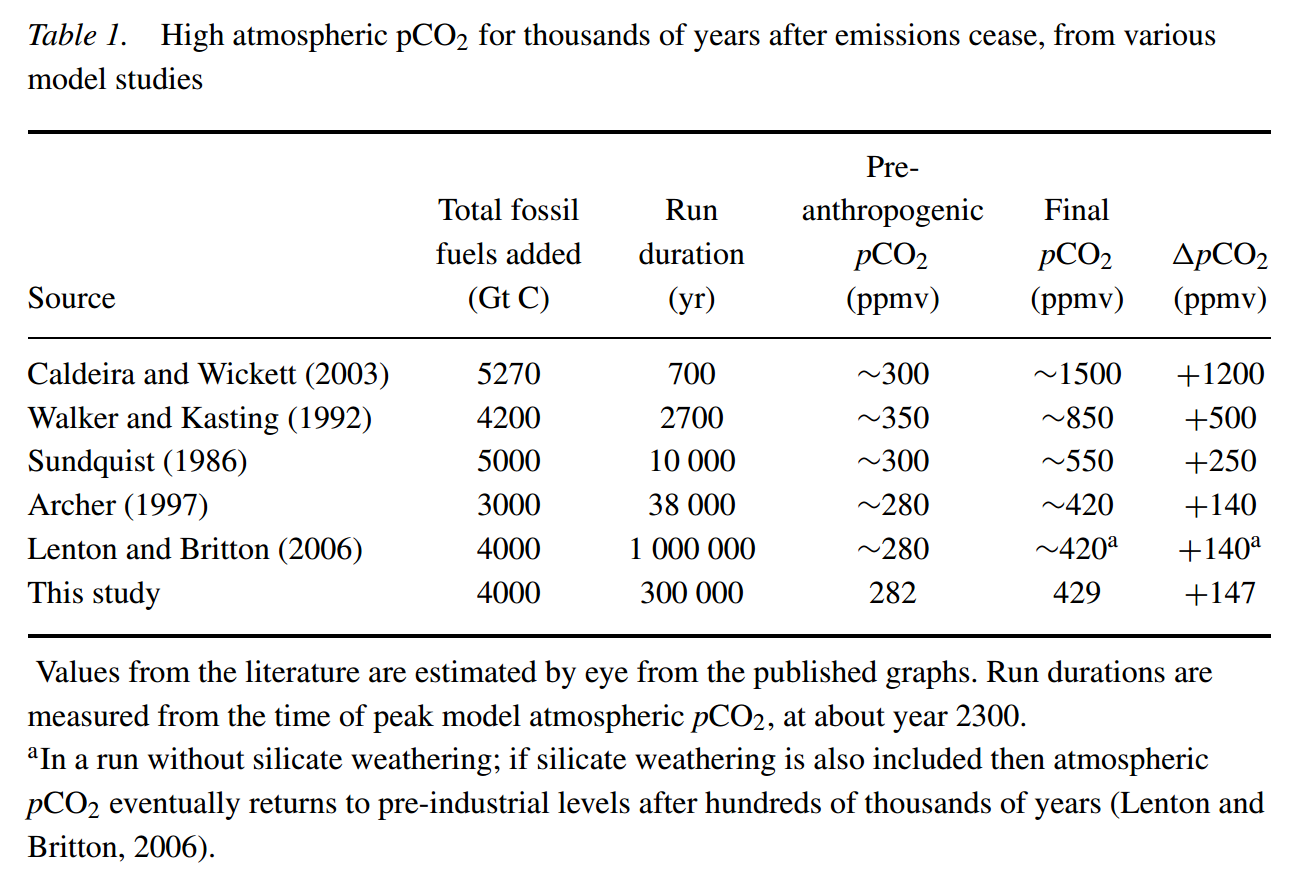 二氧化碳排放可能在如此长的时间尺度上继续产生影响的想法已经得到了其他一些作者的确认。例如,这篇论文总结了其他研究,这些研究也发现在未来数万年甚至数百万年内二氧化碳浓度仍然很高: