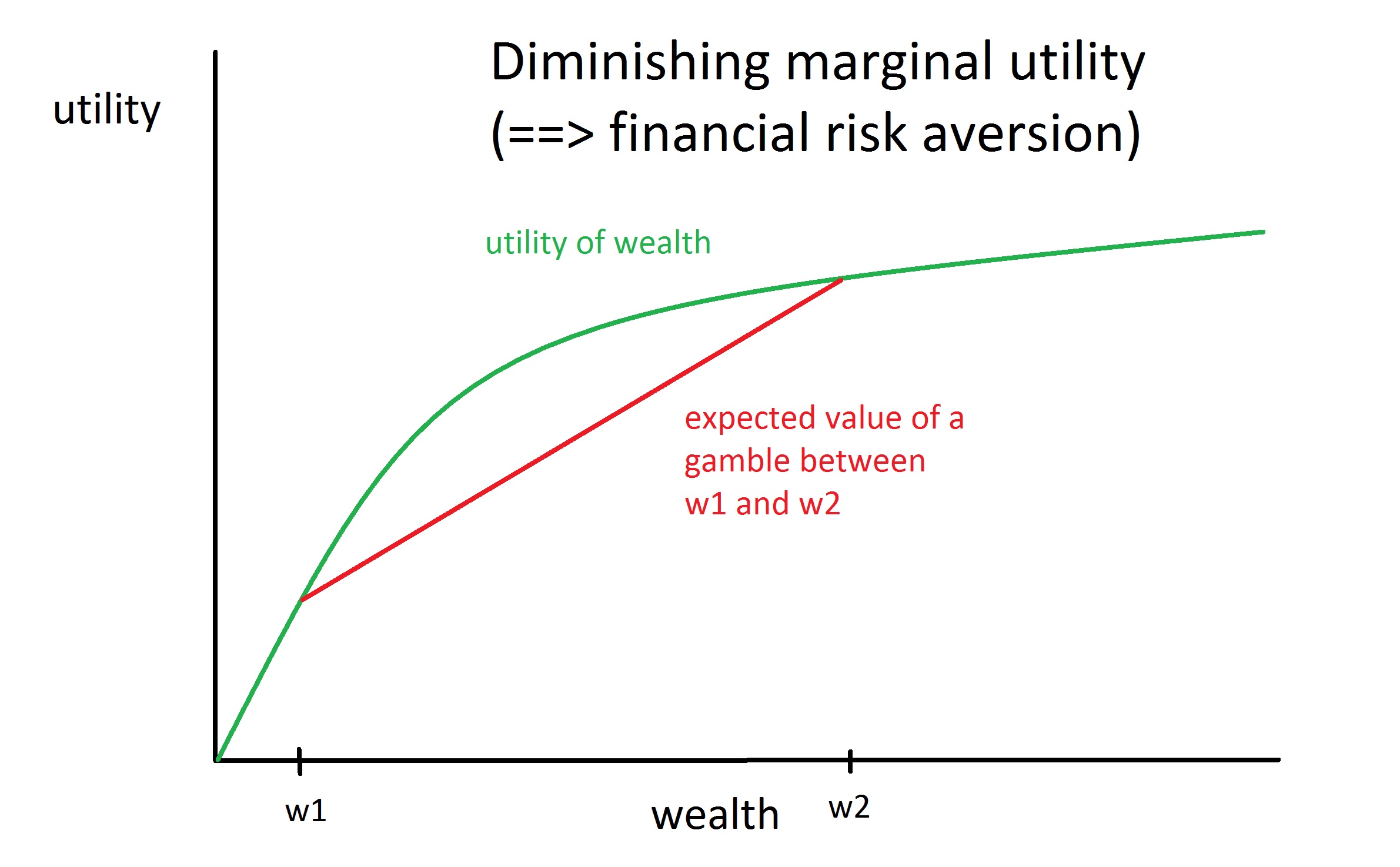 个人在财务上规避风险是因为财富的边际效用递减:确保基本需求得到满足比冒险赌博获得第二套豪宅更重要。