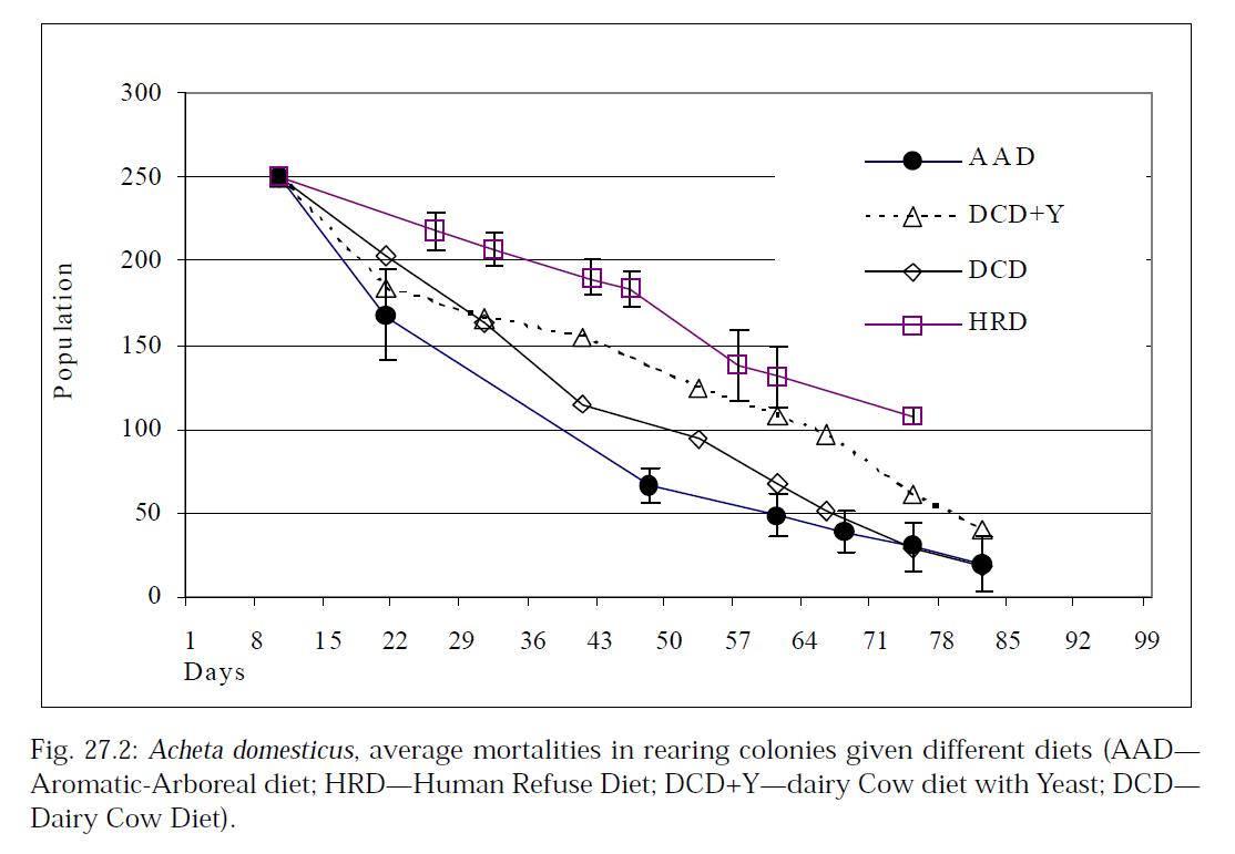 与对照饮食相比,家蟋蟀的实验饮食导致更低的存活率:在6%到27%之间。Oonincx等人(2015)解释说,关于家蟋蟀:"在所有饮食中,这个物种的存活率都可以被认为是低的,可能除了它们的对照饮食(55%)。较早的研究报告说[...]存活率可以高达80%。一项更近期的研究报告了与我们的研究类似的低存活率(24-47.5%)。这些差异可能归因于[...]密度病毒。"