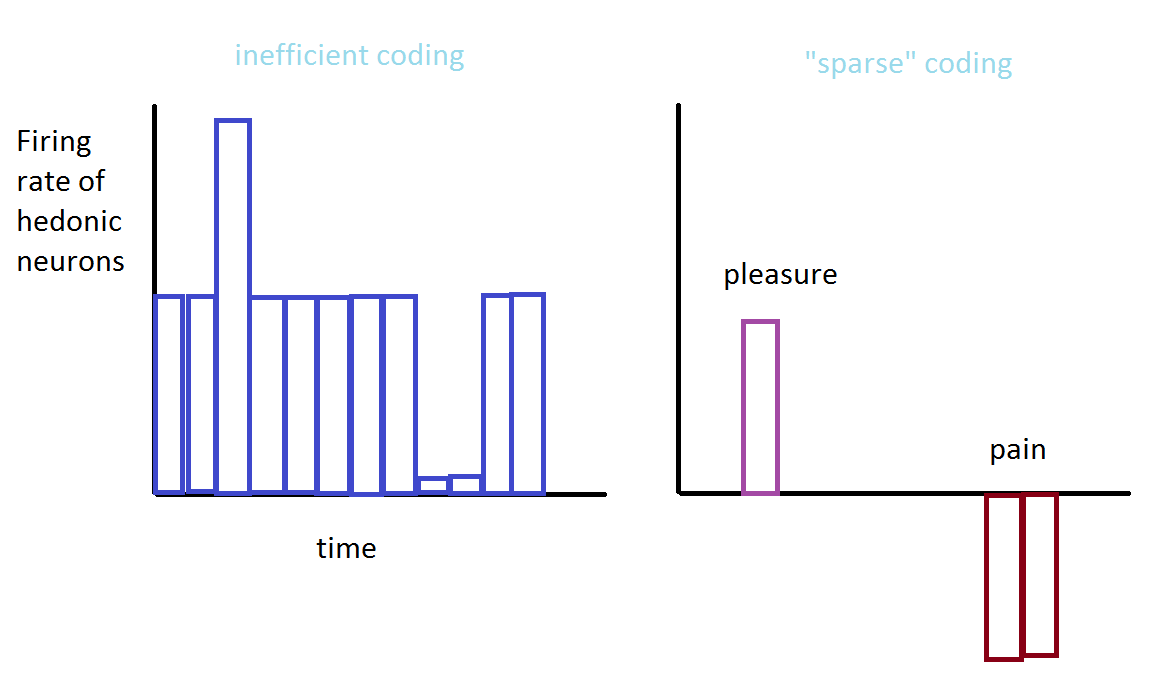 当然,这个解释将问题推回了:为什么进化给了我们不同的大脑系统来处理奖励vs惩罚?幸运的是,这个难题可能更容易解决。也许,正如Yew-Kwang Ng所说,大脑总是激活奖励或惩罚处理是低效的。可能更有效的做法是只在发生不寻常事件时激活它们,比如受伤或性高潮。在更普通、日常的体验中,当好的或坏的方面都没有发生重大事情时,奖励/惩罚系统不必那么强烈地激活,而且由于这些默认、普通的体验往往是最常见的,大脑总体上通过在默认、普通情况下最少激活快感系统来节省精力。也许这种最小化快乐/痛苦系统需要激活的频率的想法可以被视为稀疏编码的时间形式:"时间稀疏性('相对较少的时间段是活跃的')"。或者,也许快乐/痛苦系统一直在激活,但默认、普通的体验激活的快乐/痛苦神经元比更强烈的体验少。Foldiak和Endres (2008):