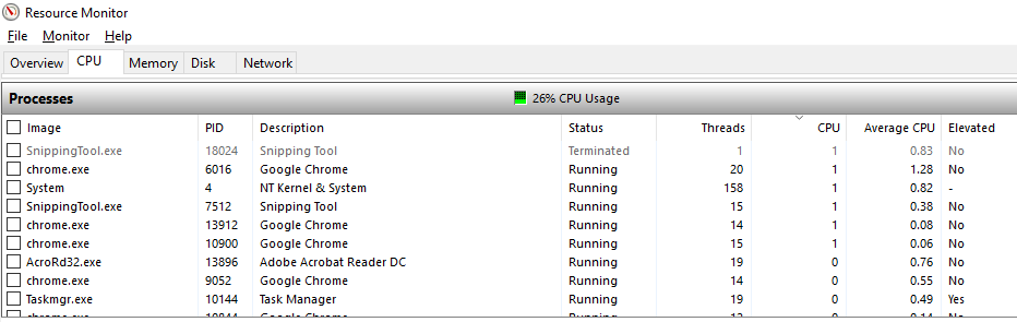 以下是我的"资源监视器"屏幕截图,显示了上述段落中提到的"chrome.exe"进程。("资源监视器"与"任务管理器"不同,但为了简化说明,我将两者混为一谈。)